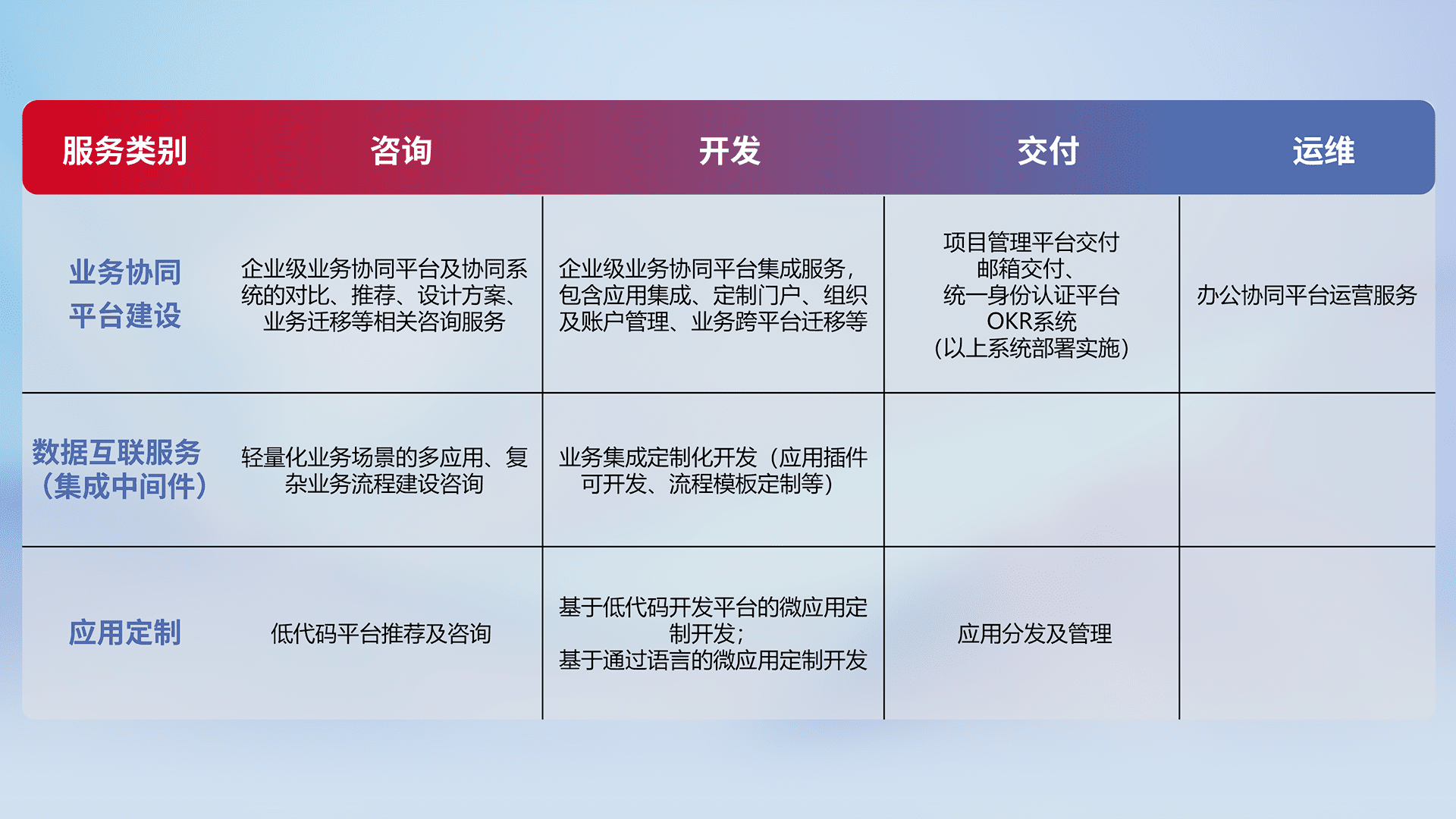 针对钉钉、、、企微、、、、IDaas等平台级产品提供产品的规划、、、方案、、、交付、、定制化开发等服务,,,,实现如统一协同办公、、智能客户服务、、、混合会议管理、、智能数据查询、、等业务场景,,,实现数字化转型。。。。
